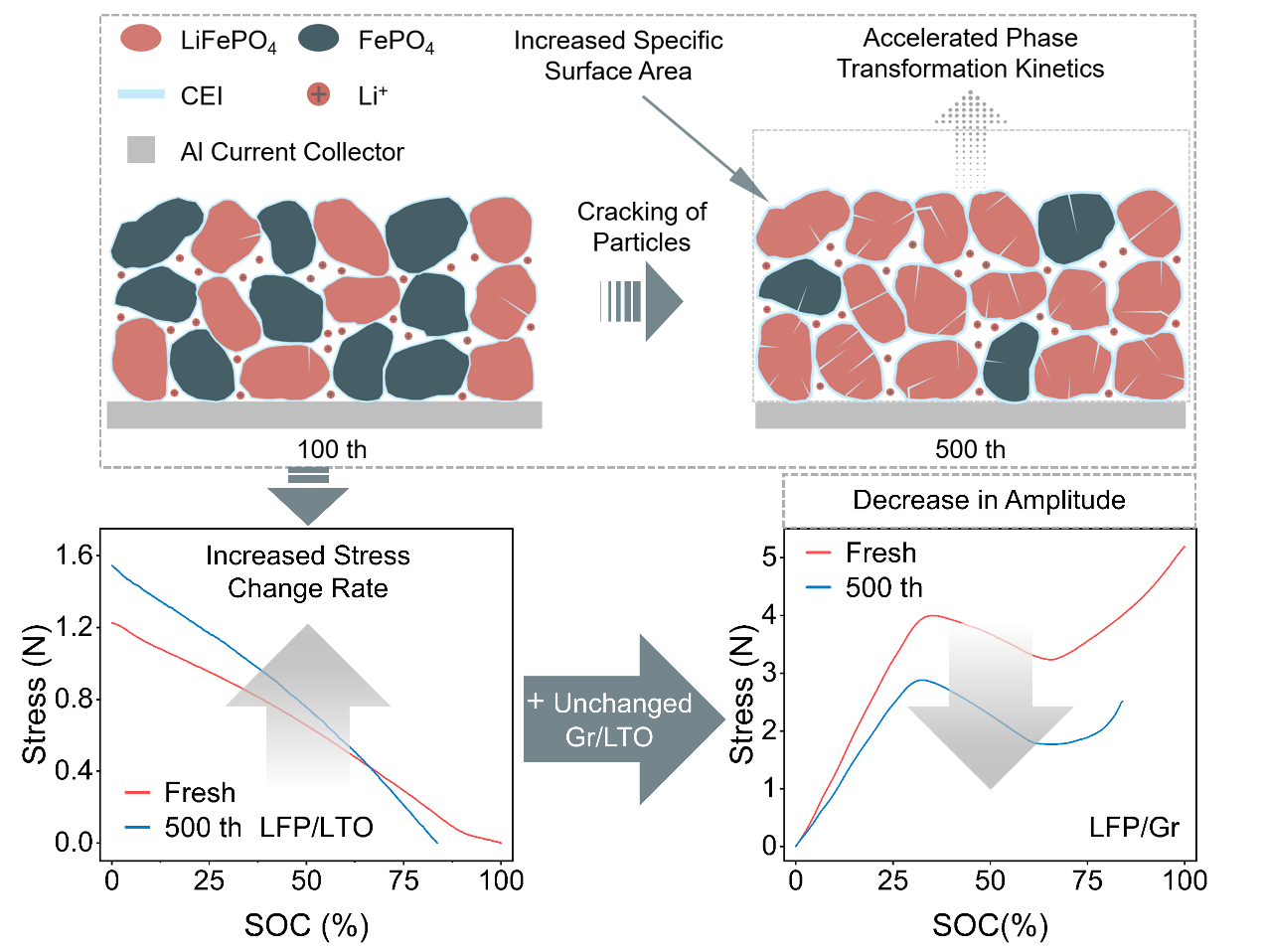 LiFePO4/graphite (LFP/Gr) batteries are extensively used in energy storage. During cycling, the repeated lithiation/delithiation of active materials induces periodic stress fluctuations, which negatively impact electrochemical performance. Unveiling the correlation between stress evolution and electrode-level changes during long-term cycling is crucial for accurately estimating the state of health of the battery. Herein, a selfdeveloped high-precision in situ stress monitoring platform is used to track the stress evolution of LFP/Gr batteries over 500 cycles in real time. By combining the characterization of transmission electron microscopy(TEM) and X-ray photoelectron spectroscopy(XPS), it is found that the increase in the stress baseline during aging can reflect the thickening of the solid electrolyte interphase (SEI) on the Gr particles, while the change in the stresscurve amplitude indicates an increase in the cracking degree and proportion of LFP particles owing to the increased specific surface area of the cracked LFP particles that accelerate the phase-change rate on the positive electrode side. By establishing the connection between macroscopic stress features and electrode microstructures, this research provides experimental evidence for further stress-based battery state estimation technologies.